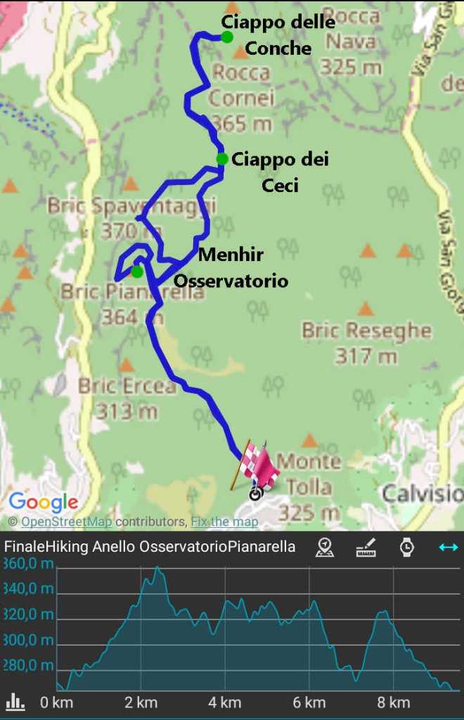 Interessante la visita al sito archeologico dell’”Orologio Solare di Bric Pianarella” una pietra naturale alta circa 90 cm infissa in una spaccatura della roccia, che presenta un foro nella parte superiore, all’interno del quale è possibile assistere alla nascita del sole negli equinozi di primavera e d’autunno. Lungo il percorso si attraversano i due grandi lastroni di roccia : il Ciappo delle Conche e il Ciappo dei Ceci dove vale la pena una sosta ad ammirare le splendide incisioni rupestri e il Riparo dei Buoi’ sito archeologico costituito da una nicchia in roccia con una serie di sedili scavati all’interno dall’aspetto molto suggestivo.